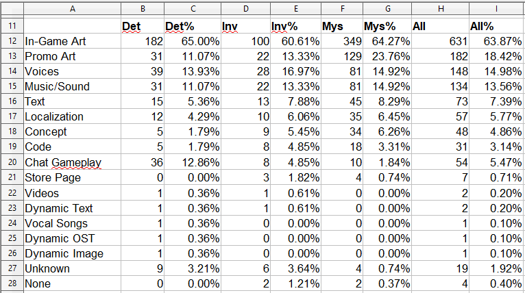 Here we’re looking at the actual types of content created using generative AI for each tag. I had to manually look at each disclosure text for all games to categorize it properly, so this took a long time! Actually, Grok helped out toward the end, and was surprisingly accurate when I double-checked.