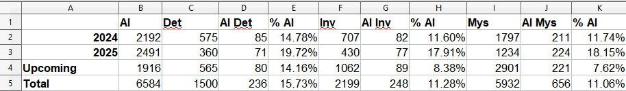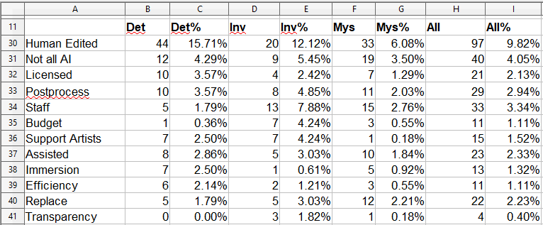 It’s also a bit hard to tell, but if you add up the percentages you’ll see that at least 30% of all AI-powered mystery games wrote some kind of justification for their usage of AI.